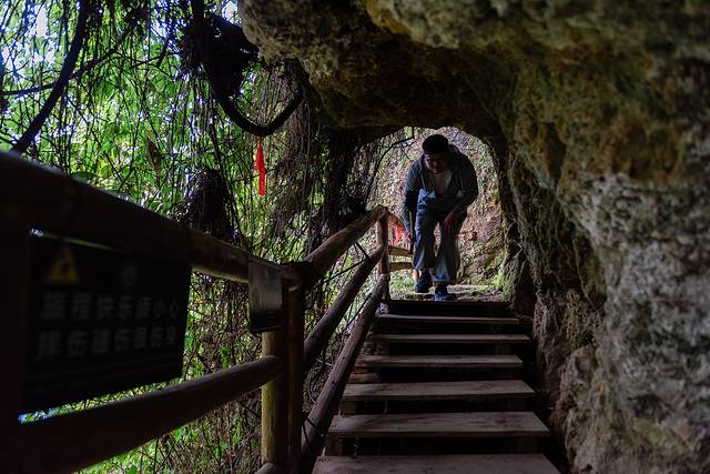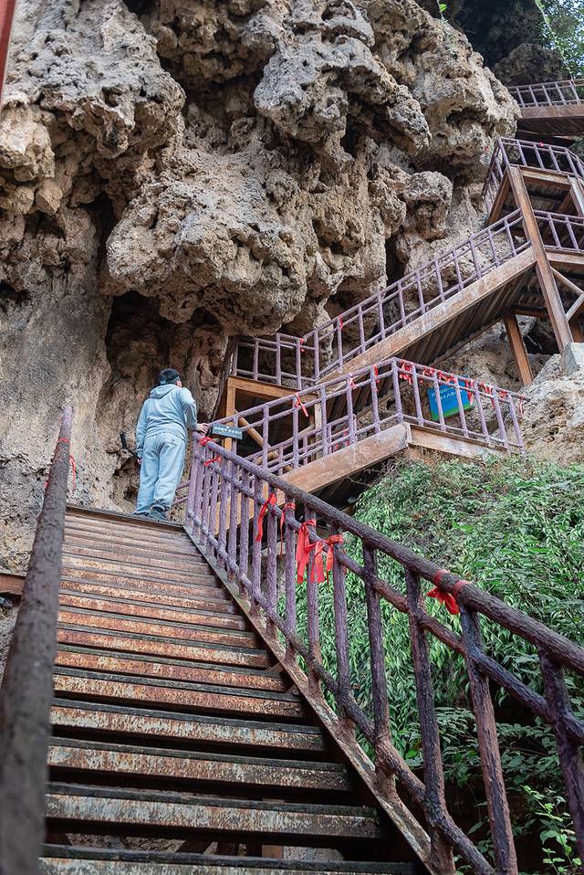 我们走的A线,进山刚开始的路并没有特别吸引人。但万万没想到过寺庙后就直接给出了超预期的惊喜和感动。刚开始是顺着阶梯往上爬,陡峭的台阶之上是触手可及的钟乳石。再往上就能进入賨人居住过的洞穴内游览,攀上陡峭的崖居古栈,便是賨人穴居部落遗址。