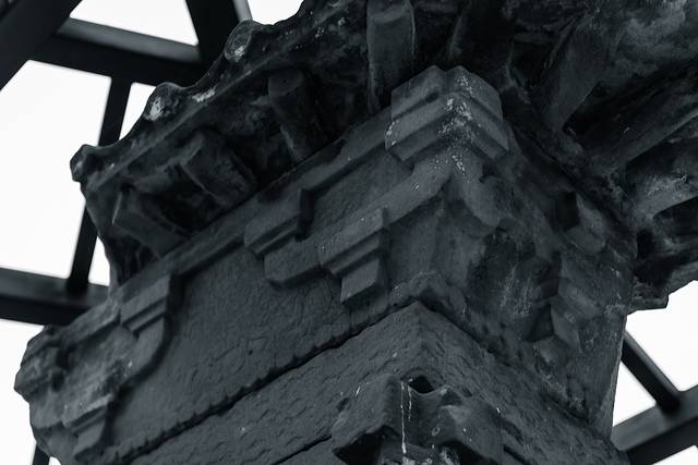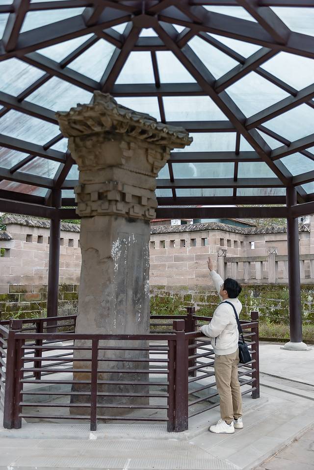 进门后往下走了几级台阶,走进 新建 的透明玻璃亭子,便能近距离与这尊屹立近2000年的文物对视。冯焕阙跟另外几处 渠县 汉阙的结构形制基本相同,由阙基(阙座)、阙身、阙楼、阙顶四部分构成,原均为双阙且每阙都为子母阙,现子阙都已不复存在。