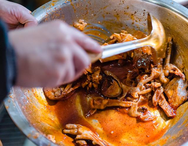 老板一边拌着鸡片,一 边和 我说:早上才从山上逮的跑山鸡,你看“好巴适”嘛! 但对于那些馋嘴的老食客来说,只需要往柜子上看一眼,就知道那些才是鸡肉的精髓。