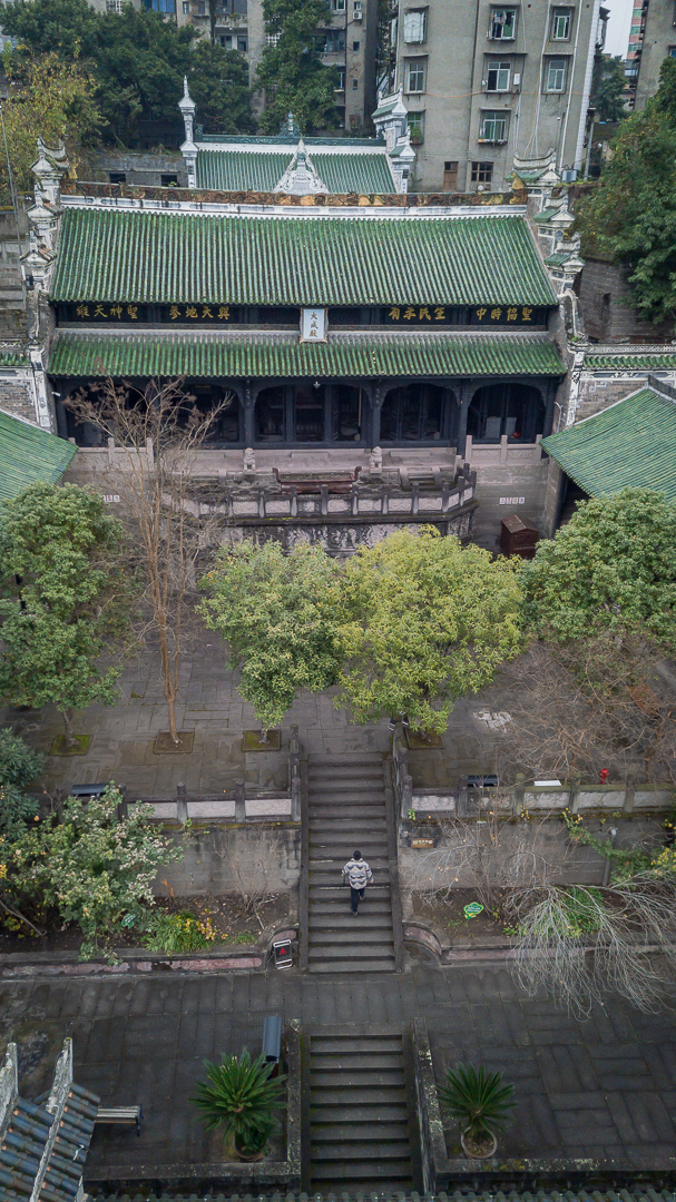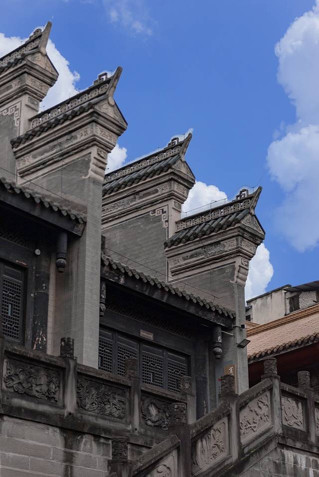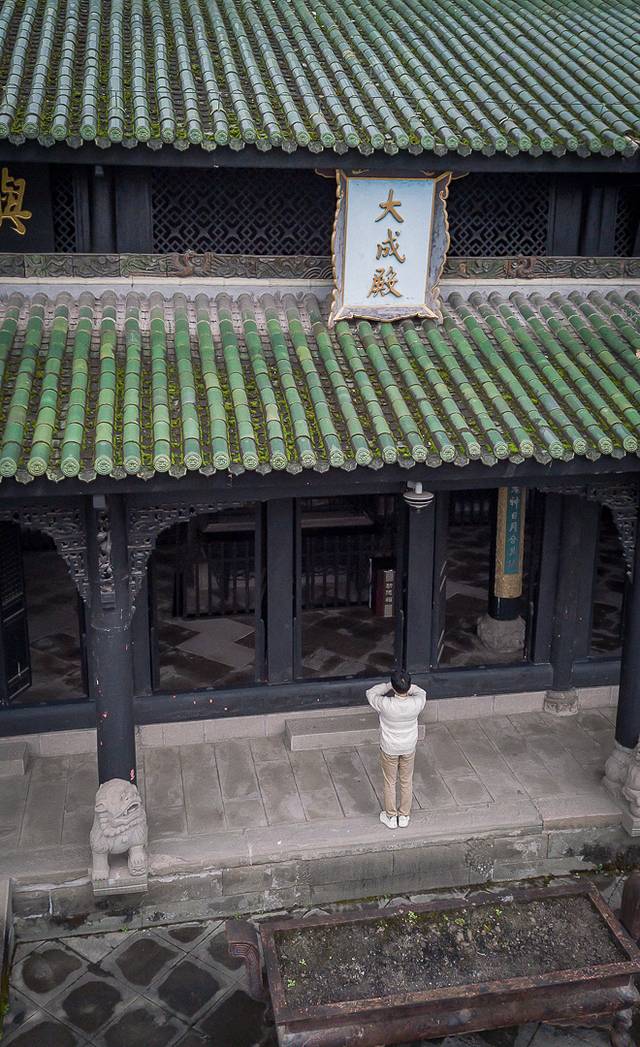 再沿着台阶往上走就能看见大成殿,这文庙的制高点,也是最值得参观的地方,为抬梁穿斗混合式结构,明间顶施藻井,两重檐硬山式,搭配马头山墙和绿色琉璃瓦,相当美观独特。翻看民国《 渠县 志》记棂星门“雕刻精美,绝川中未曾有之”,誉为“蜀中牌坊之首”。