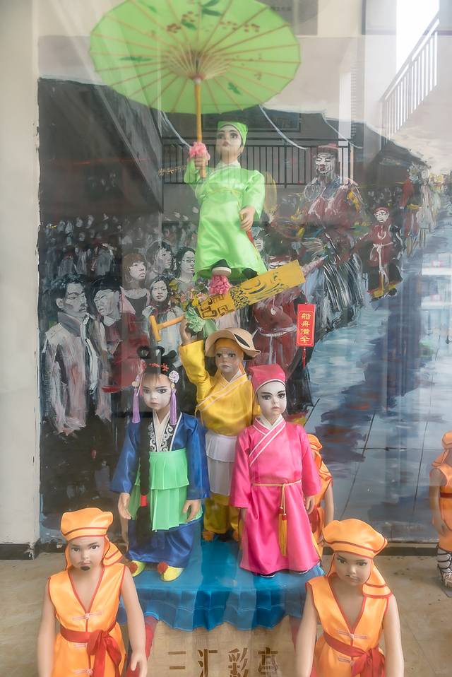三汇彩亭会以亭子造型和表演为主要特点,在每年农历三月十六日至十八日的时候会在街道或广场进行表演,只是我来的不是时候,但我在彩亭广场的历史文化长廊发现了一些保留下来的照片的雕塑。