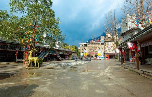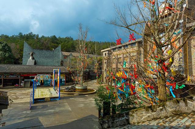 一个篝火堆在广场的中间,两旁是屋舍,贩卖着景区内的小吃和特产,充满着羌式风情的建筑却让我们眼前一亮,难得一见这样的建筑也让我们多看了一会。
