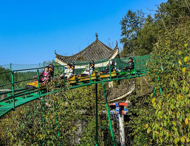 从一旁的步道上行,可以坐高空滑道少走一段路,也可以走游步道在森林间漫步向上,我们懒人出行当然是少不了坐上小滑车代步啦,享受这种山野之间的慢生活,看着远山的风景到达一段小吃街。