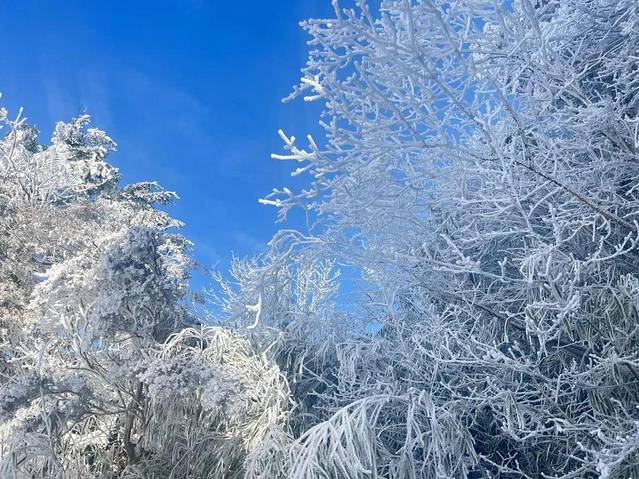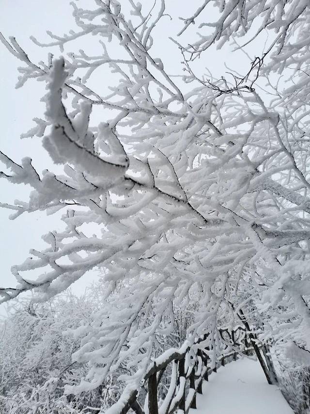 台阶两侧的树叶因水汽凝结,变幻出我们现在所见的玉树琼枝,阳光照射下闪闪发光,好看得很~