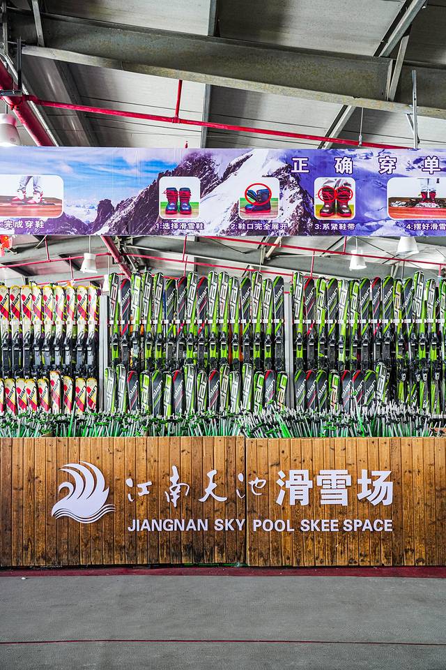最后走到一楼是滑雪场入口,这里可以挑选单板和双板,建议没有滑雪经验或者滑雪技术一般的朋友都来选双板。