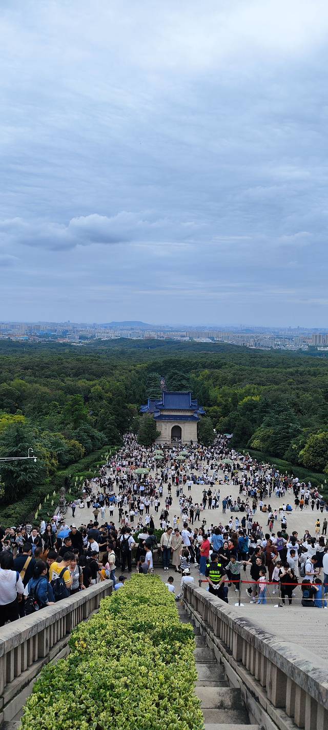站在中山陵的最高处往下看,只能看到平台看不到台阶,而南京城尽收眼底。