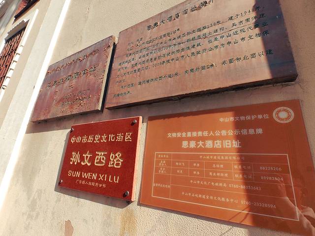 思豪大酒店旧址位于中山市石岐区孙文西路150号。酒店的主体建筑是一栋南洋风格的五层楼房,其顶楼高耸的钟楼引人注目,是孙文西路步行街的标志性景观。民国三十七年四月四日(即1948年4月4日),思豪大酒店开业。二楼以上共设43个客房,采用西方酒店业的经营模式,是中山最早开办的酒店、最先经营西餐的酒店,也是当时名气最大的酒店。