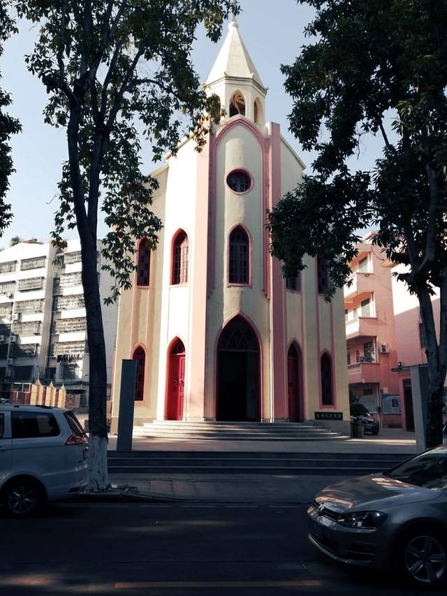 中山市石岐区圣母无染原罪天主教堂,又称石岐天主教堂,是安普灵神甫前来中山任总司铎时于1942年建成的一间比较现代化仿哥特式教堂,全部水泥钢筋结构。教堂坐北向南,顶部盖一层绿瓦,外墙用粉红色石米粉刷。教堂正面高约15米,钟楼设在顶部(从没敲过钟),钟楼顶端竖有1米高的十字架。教堂门口右侧有旋梯直上顶部钟楼,教堂内两边有骑楼式边廊,方便清洁窗户和教堂上部,也属一种装饰。教堂内状如合掌祈祷,具有浓厚的宗教色彩和较高的建筑艺术。教堂上下对称地设置尖形拱门和尖形拱窗,装上七彩玻璃,大量光线从彩窗射入,使高处的顶棚像飘浮在教堂上空一样,使所有在教堂里的人都有升至无形的空中,给人一种向上升华,天国神秘的感觉。教堂约600平方米,内壁两边依次挂有耶稣受难、复活的画像。祭台约20平方米,高大慈祥的圣母像竖立在正中,整个祭台既简朴又华丽,站在那里,就好像处在一个与世隔绝的非物质世界里。上世纪九十年代,教堂进行简单装修,外墙粉红色石米,地面铺粉红色磨石板,代替原来凹凸不平的地板,配上咖啡色的椅凳,给人一种庄严、整洁、大方的感觉。
