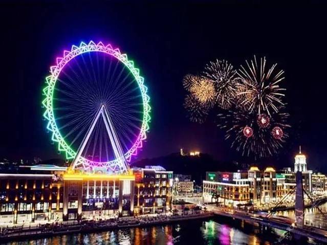 作为香山新八景之一的“岐江晚望”,说的正是每当晚霞起时,江上渔火点点,渡口人流匆匆。如今华灯初下,岐江边上与兴中广场一片火树银花,在幻彩摩天轮的炫彩夺目的灯光点缀下,一河两岸风光旖妮,浪漫倾城。