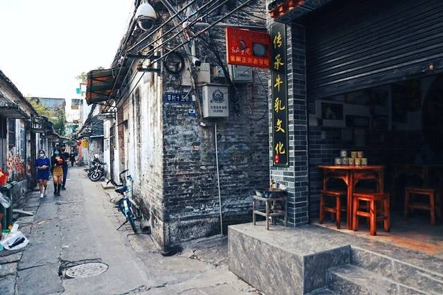 独自来莘村大街走一遍,踏着石板路,看黄墙老屋,老街里的烟火,比菜市场还要丰富。每块湿漉漉的青石板,广府特色的青砖老宅、花窗镬耳墙,或者是每扇吱呀吱呀的木门,都诉说着一段故事。街上的墙壁陈列着精心装裱过的“城南旧事”系列图片,向过往行人讲述自己的百年风华。