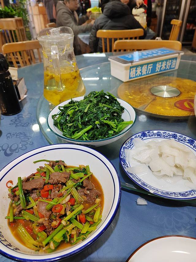 第三天早餐吃了15元一大碗的简骨粉,中午点了小炒牛肉和炒青菜,米饭上了一锅,免费的,吃完饭还送富硒米!