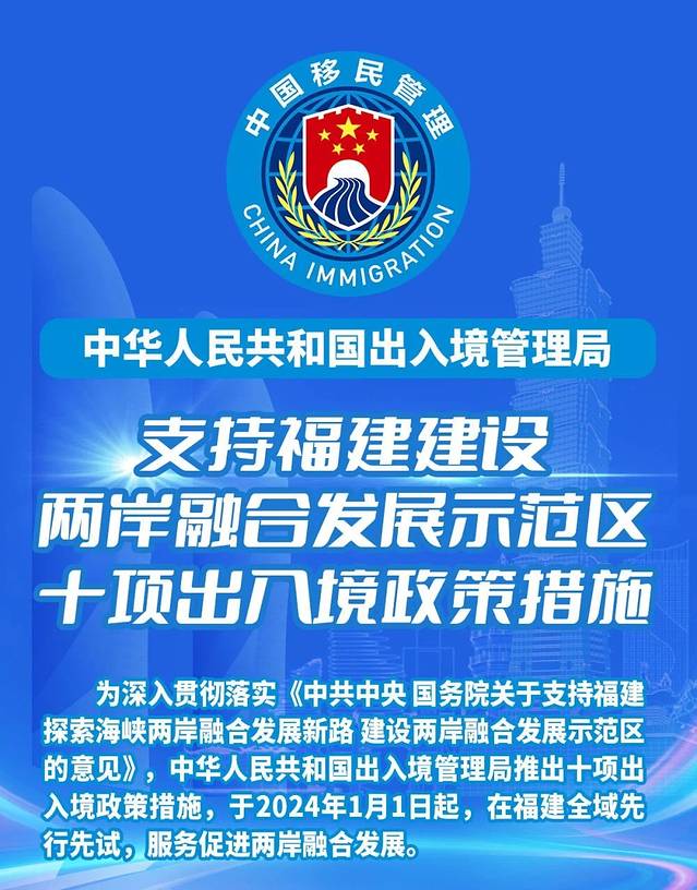 🔍 最近,国家移民管理局宣布自2024年1月1日起实施的十项新措施,旨在深化 福建 与 台湾 的融合发展。这不仅是一项政策上的创新,更是对两岸关系友好发展的有力证明!