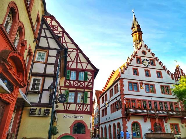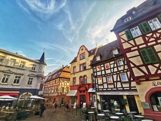其实不光是夜晚,市场广场的白天更是人头攒动的,清晨的阳光如约而至,巴符州不愧是德国阳光的那一面(sunny side of Germany)。在艳阳之下,我也得以一睹市场广场的真颜。这个16世纪的地中海市场,位于 Gerberbachviertel 和 Schloss Berckheim(今天的市政厅)之间的一个小斜坡上。这座意大利风格的广场左右两侧排列着迷人的半木结构建筑,是万海姆的心脏地带。小酒馆、餐馆、咖啡厅两边并排排开,遮阳伞下,坐满了来自世界各地的客人。