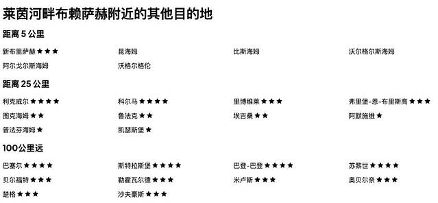 离开根根巴赫,下一站便是布赖萨赫,需要开车约1小时或乘坐火车2小时才能抵达。布莱萨赫小镇位于莱茵河畔,被誉为通往德国黑森林的门户。这里实在是坐拥太过优秀的地理位置,隔着著名的莱茵河和法国遥遥相望,和因为《中餐厅》而爆火的法国城市科尔马不过20分钟车程,和瑞士巴塞尔也在一小时之内可以到达,我们且来看看这里周围有多少星级旅游城市吧。