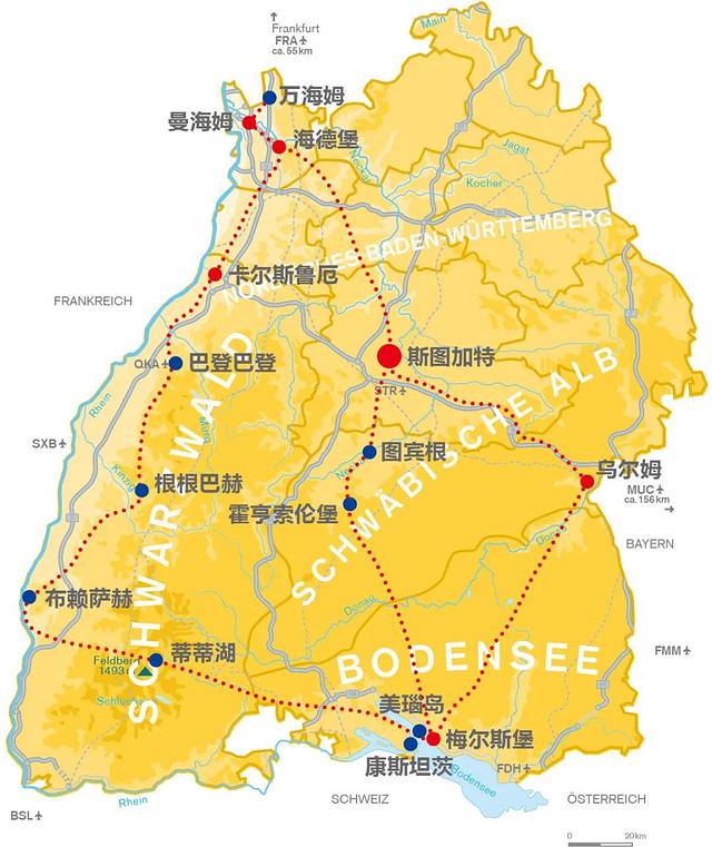熟悉德国旅行的朋友们可能知道,德国以特定主题为线,把美好的城市们串成了不同主题的项链。这些城市自然就是项链上面各具姿态的明珠。本次我们的家庭旅行贯穿了巴符州的“仙踪之旅”(Fantastische Strasse)。下图中蓝色圆点连成的线全部走通(骄傲脸)