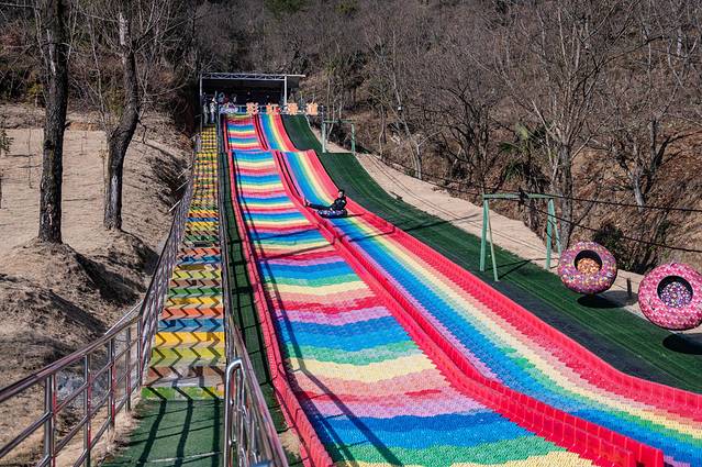 乐园上山共有两段缆车,也就有两块游玩的区域。在一号缆车的终点,就是半山区域可以玩喊泉、彩虹滑道、坑爹过山车等项目,个人感觉这块区域适合5-10岁的亲子游玩。