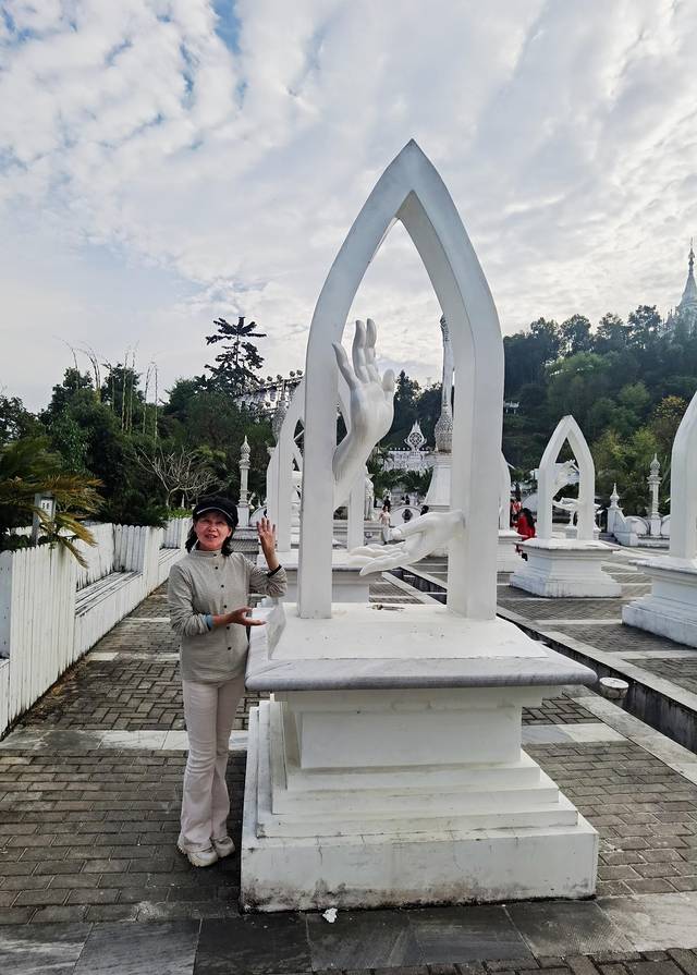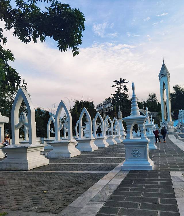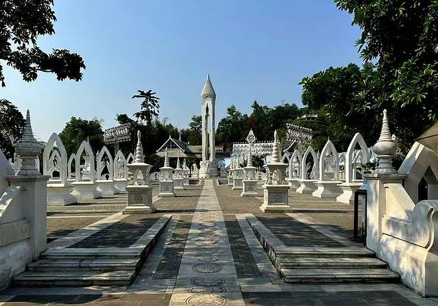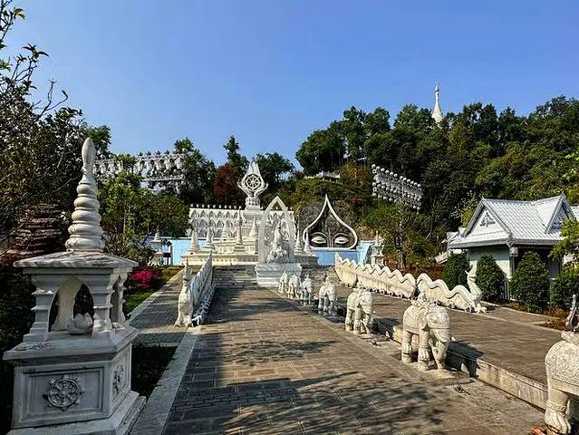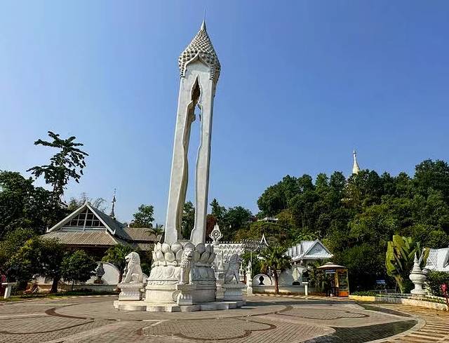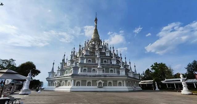 这座银塔占地面积约120亩,塔高66米,直径46米。整体建筑以纯白为基调,与勐焕大金塔形成鲜明的色彩对比。两塔同在雷牙让山之巅,一个雍容华丽,一个典雅素静。