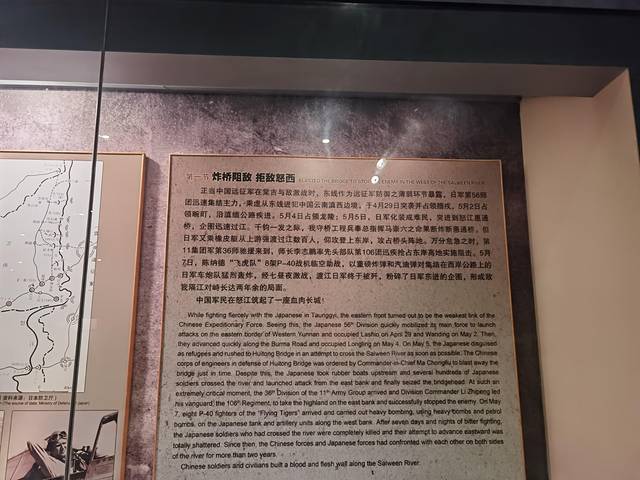 纪念馆以抗战实物为主、兼顾图片、文字及影像资料。两处展厅分为:抗战后方、御敌前线、怒江对峙、绝地反攻、逐寇出境、老兵不死、祈愿和平七个部分。
