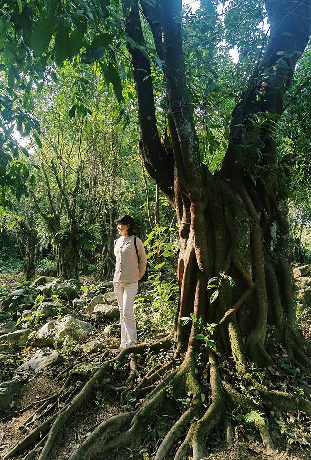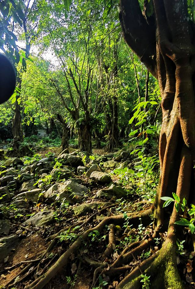 身后的道路,一侧是一片浓郁多姿的百年古榕,枝繁叶茂,盘根错节,身在其中有一种误入原始森林的错觉。