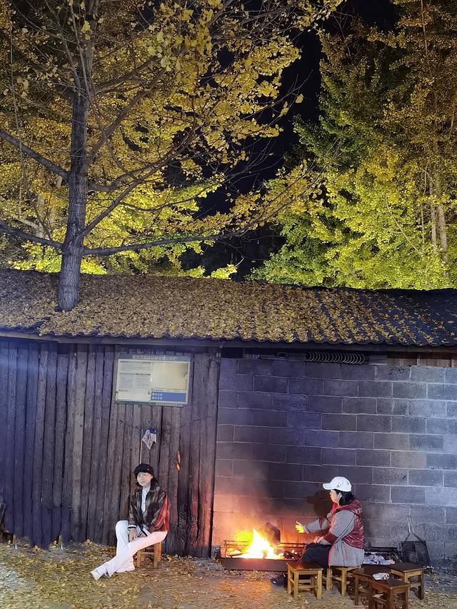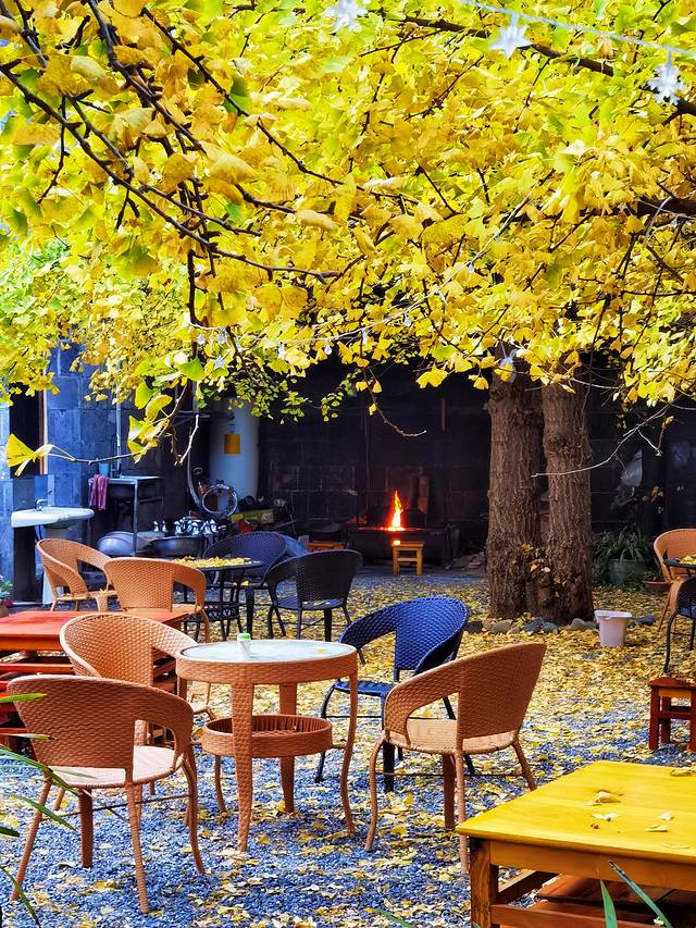 小院里有几棵很大的银杏树,黄叶洒落,炉火升腾,美好景色与生活气息相互映衬,令人舒心难忘。