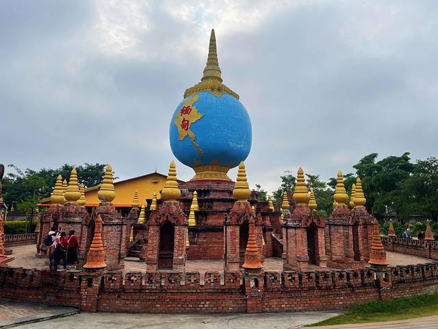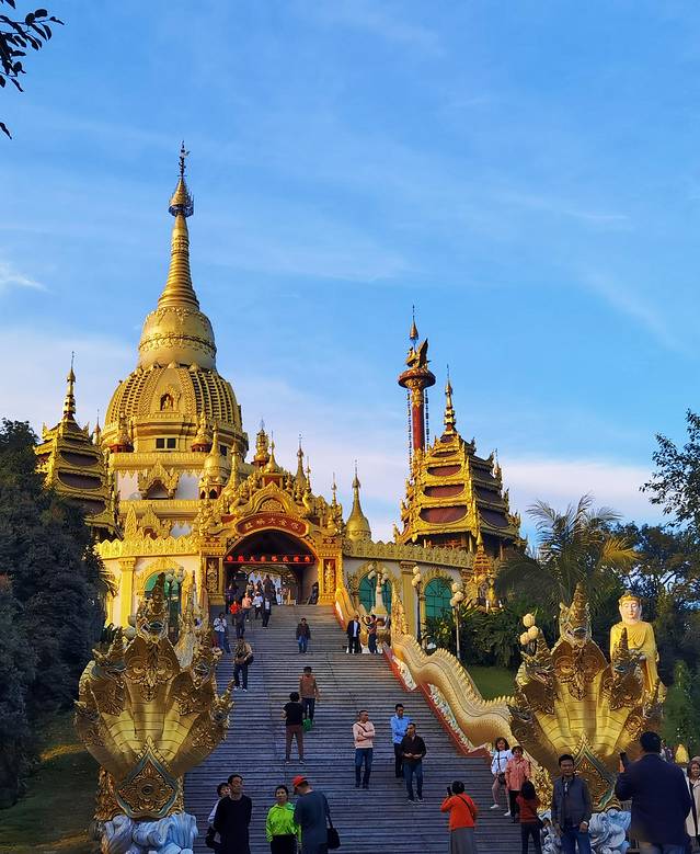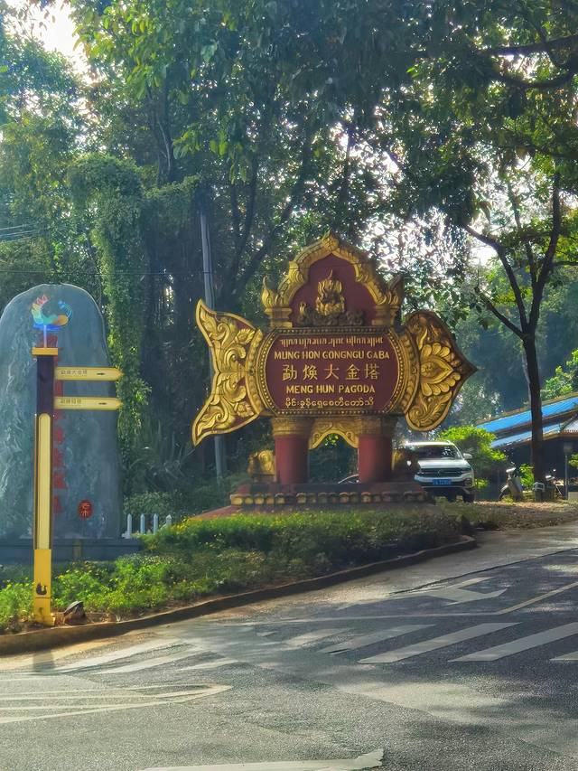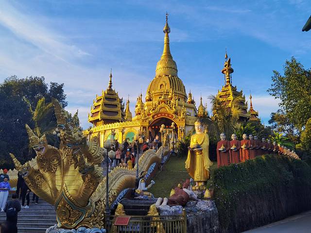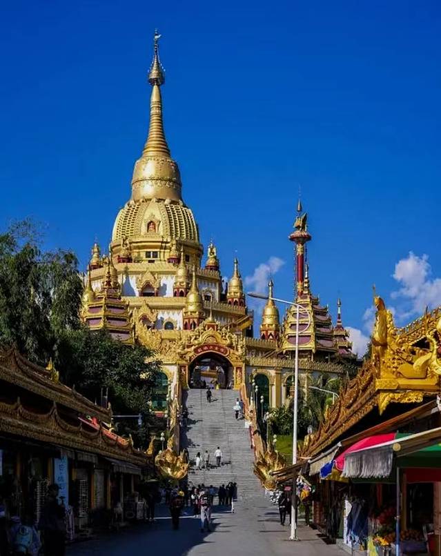 勐焕大金塔远远看去,金碧辉煌,光彩夺目,最高点镶嵌有重达2.3吨的大金顶,为黄金打造,是芒市当之无愧的标志性建筑。