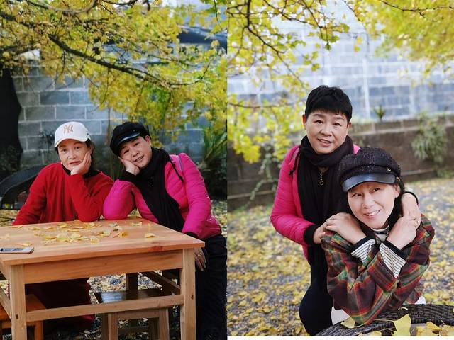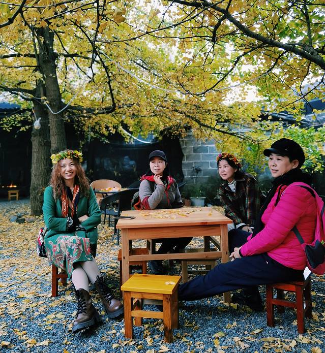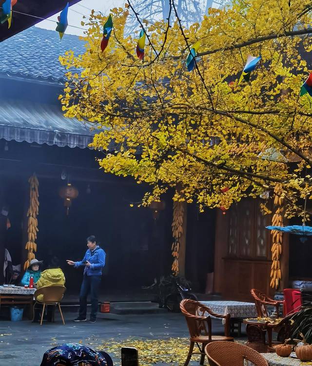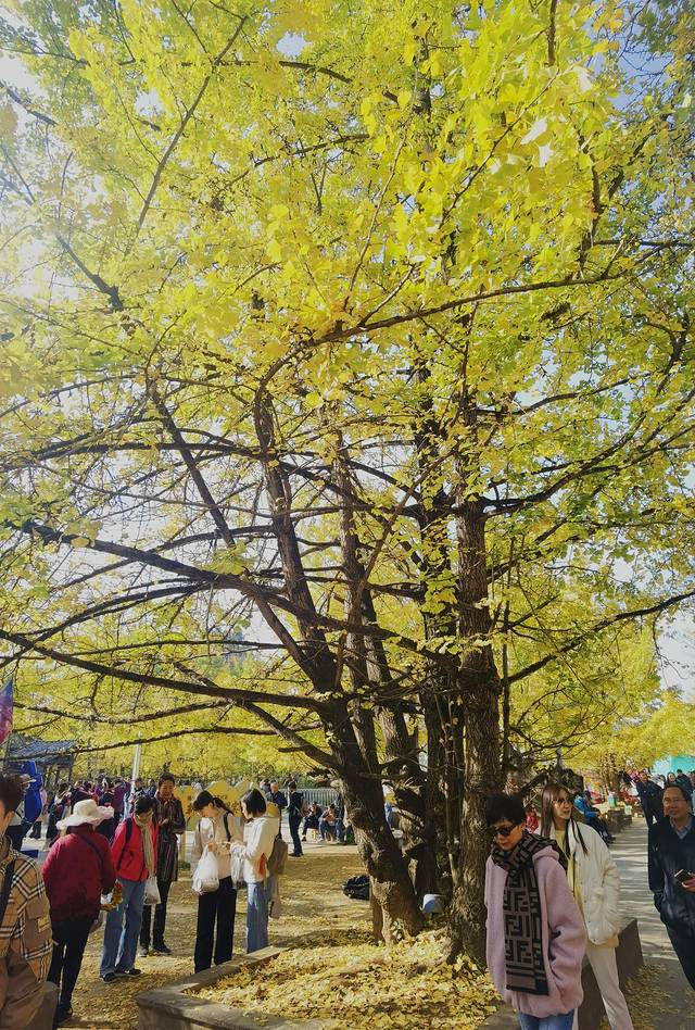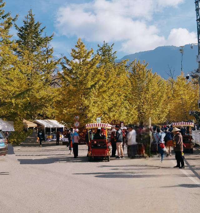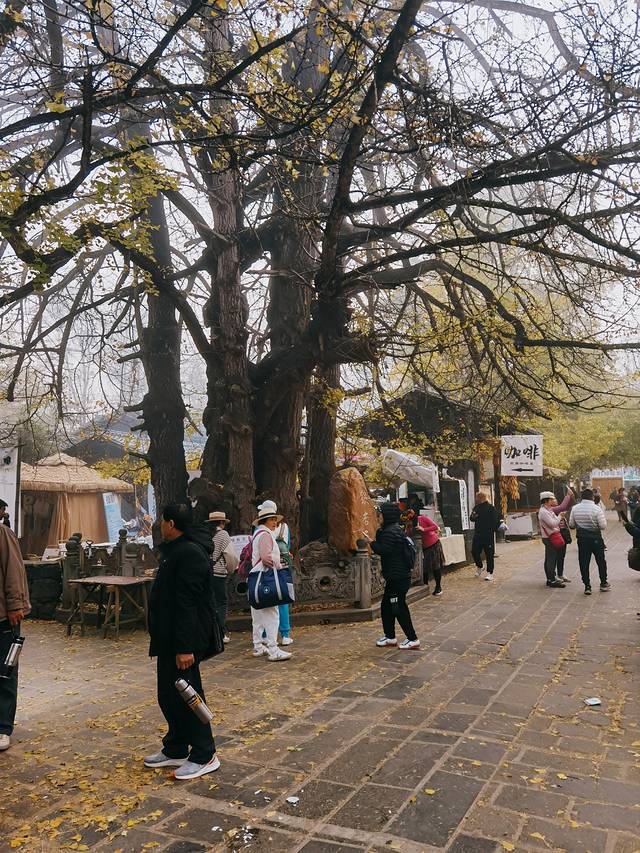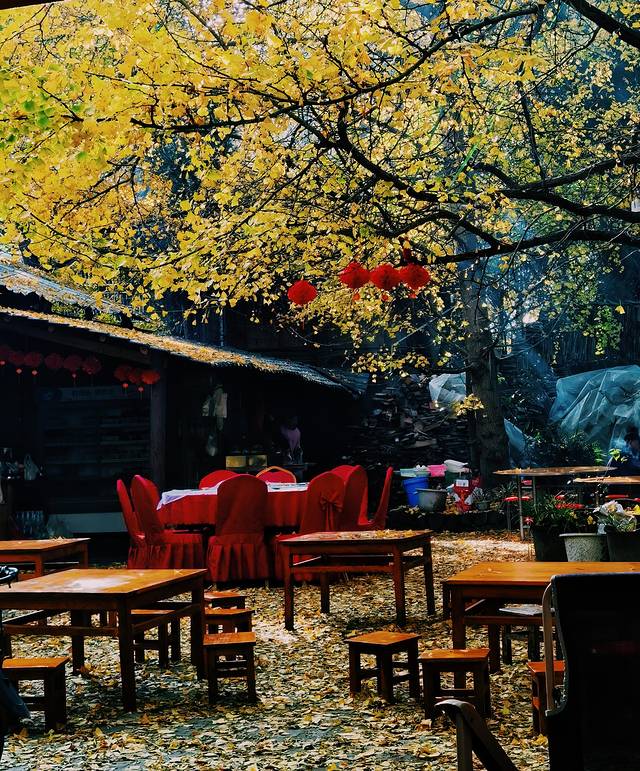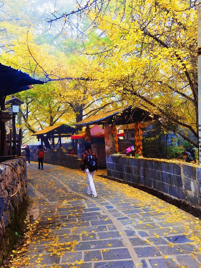 广场上银杏的叶子已经掉了大半,感觉游人比叶子还多,心中不免有点失望,后来才知道,银杏村最美的景点不在小广场,而是在客栈院内。😁😁😁。