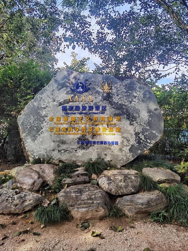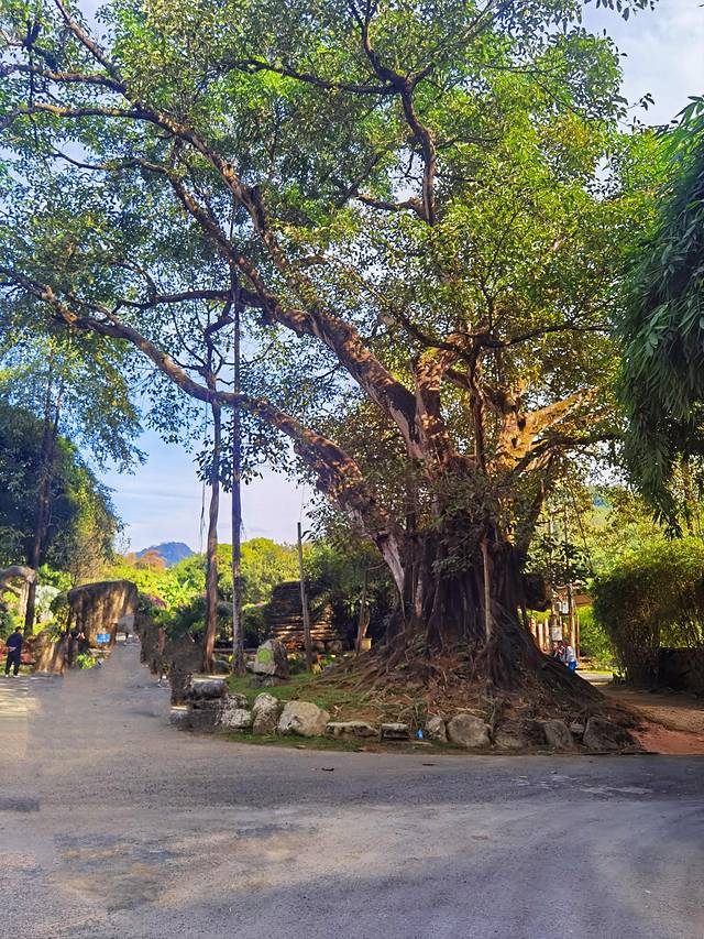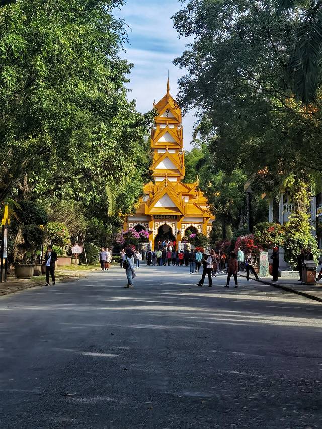 竹林过去,转过一座傣式的楼阁建筑,走进园林主干道路,经过一株600年古榕树,独木成林