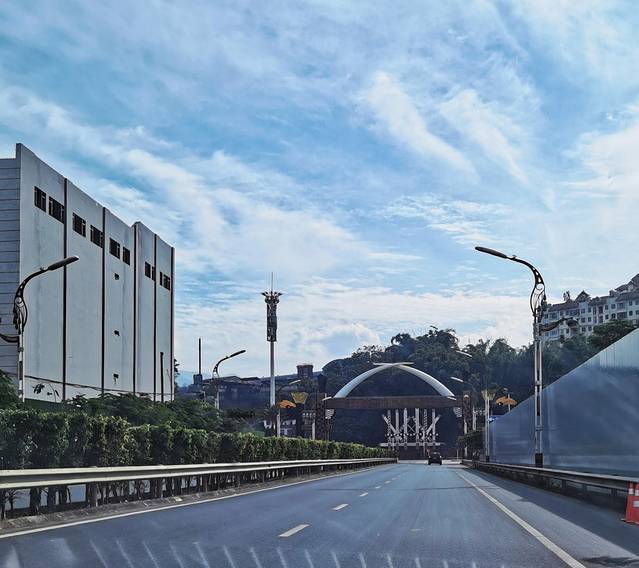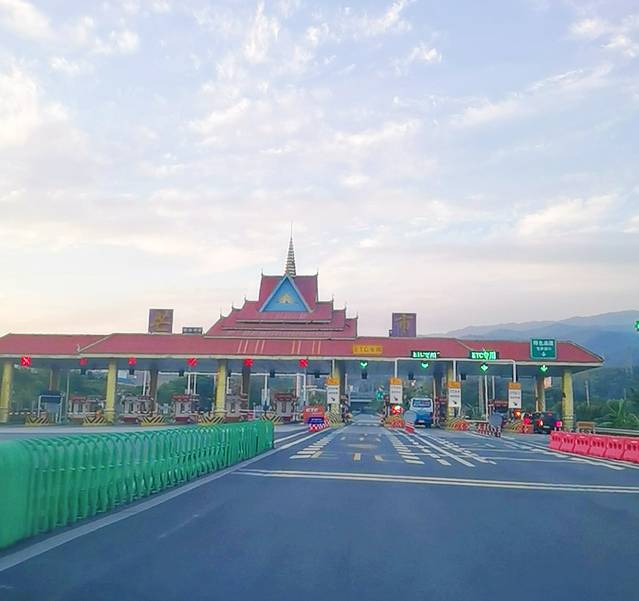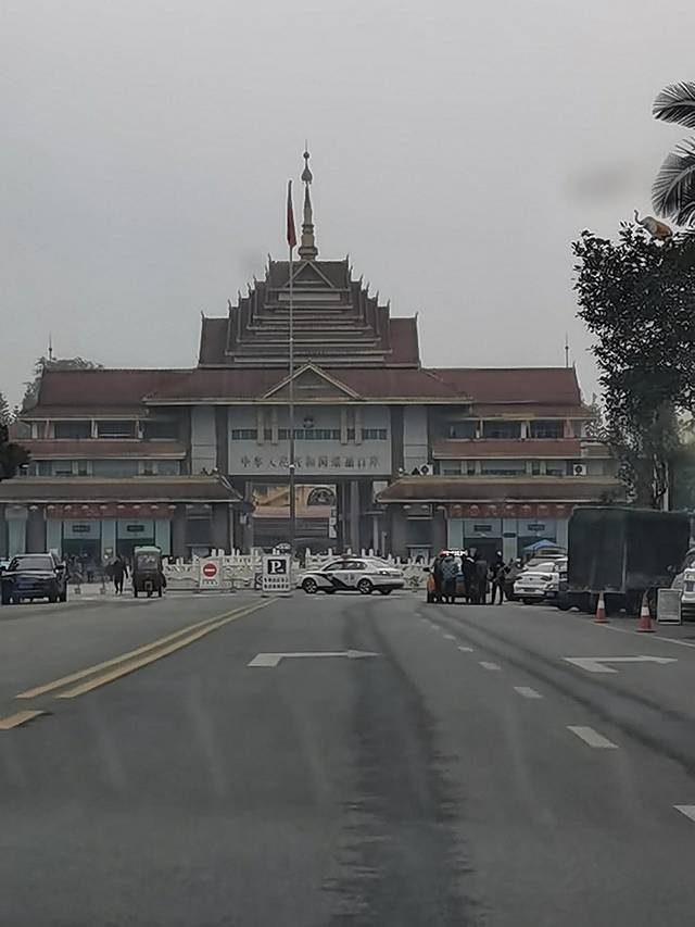抬眼望去米黄色的傣族风格国门,国旗飘扬,庄重威严。