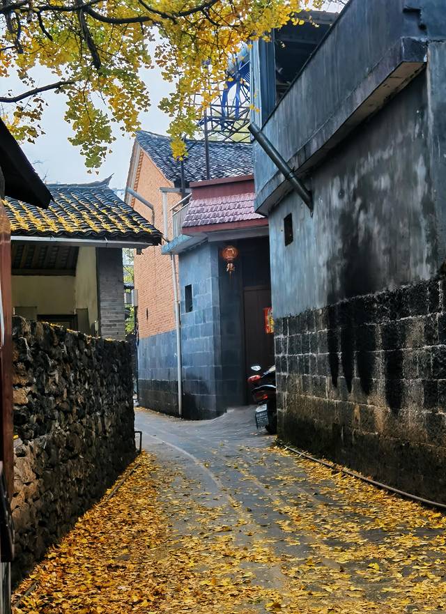 村内巷道纵横交错,古朴的房屋与大片的银杏林交相辉映,小巷里、墙头边、屋顶上,眼光所及之处无不是一片金黄。