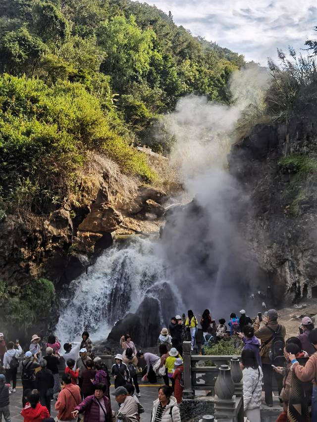 “三叠水”蒸汽弥漫,如烟如雾,因山势陡峭,河水飞泻而下形成三重瀑布,故取名“三叠水”。