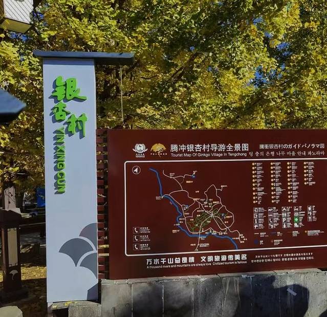 村口有导游全景图,感觉有的叶子不怎么黄,但有些都枯落了。