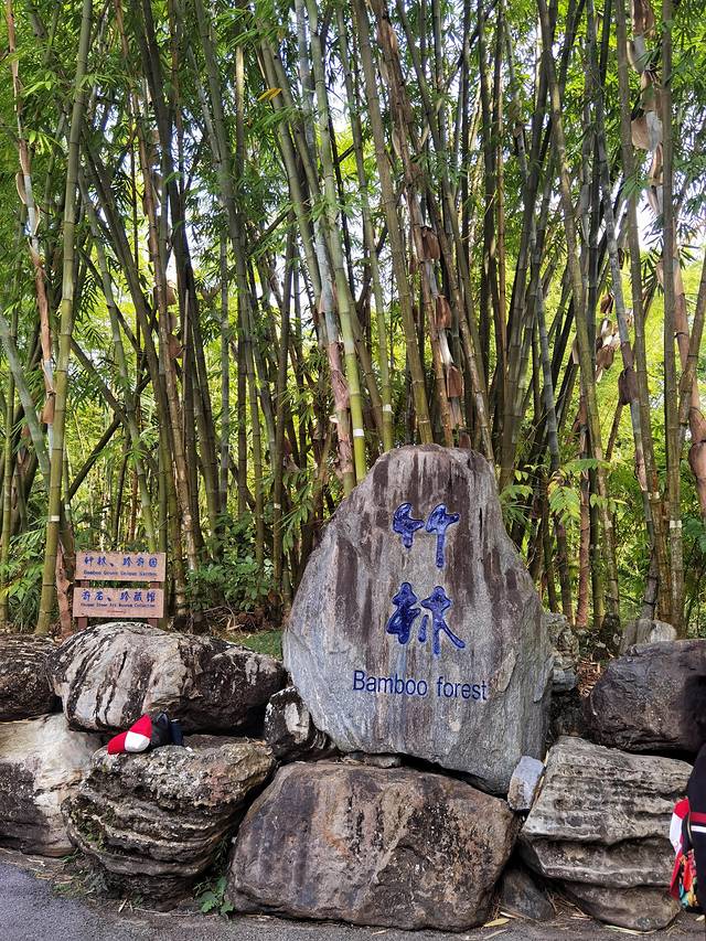 油棕排列在纪念亭前方, 如云的的箐竹簇拥成林,在微风中摇曳。