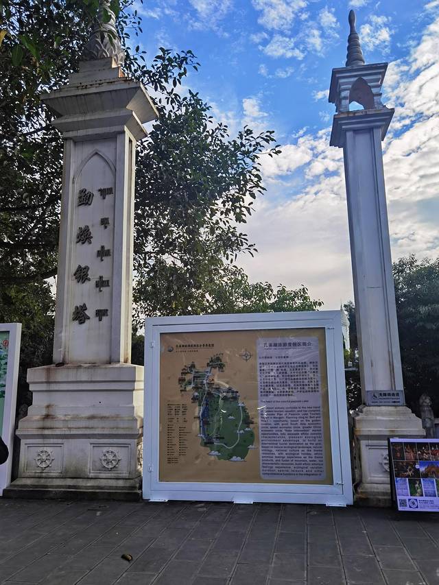 勐焕银塔景区分山上和山下两部分。山下景区,一条“地涌金莲”中轴线贯穿整个游览区,引导游人走在其上,取“步步生莲”之意