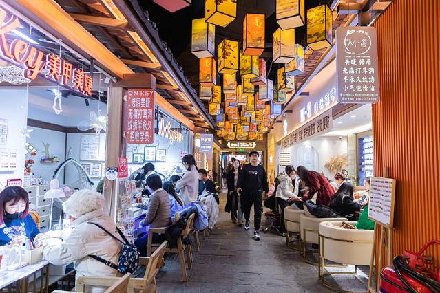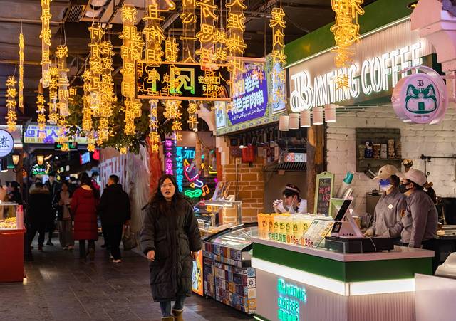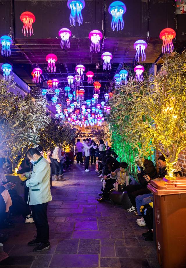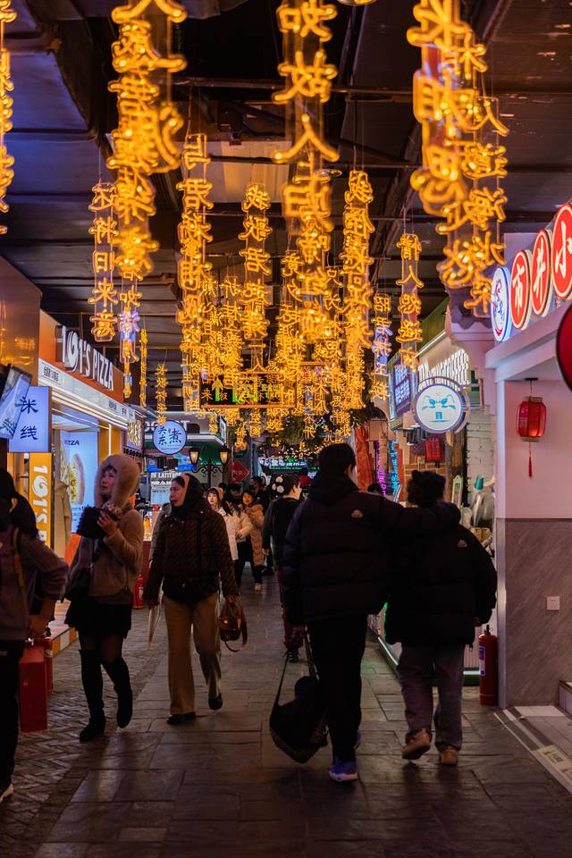 在这个繁华的夜市里,人们穿梭其中,欢声笑语不断。孩子们手拿糖葫芦,一边吃一边玩耍;年轻人则成群结队,品尝着各种美食,逛着各种文艺的店铺,享受着夜晚的美好时光。