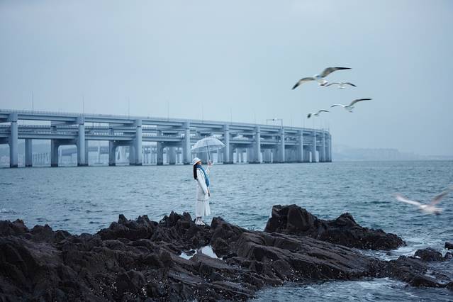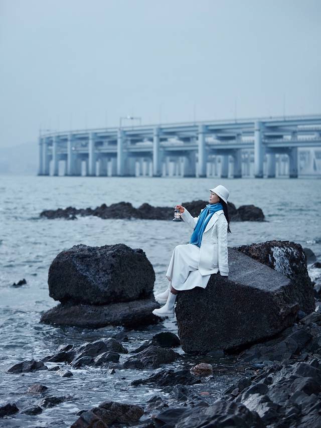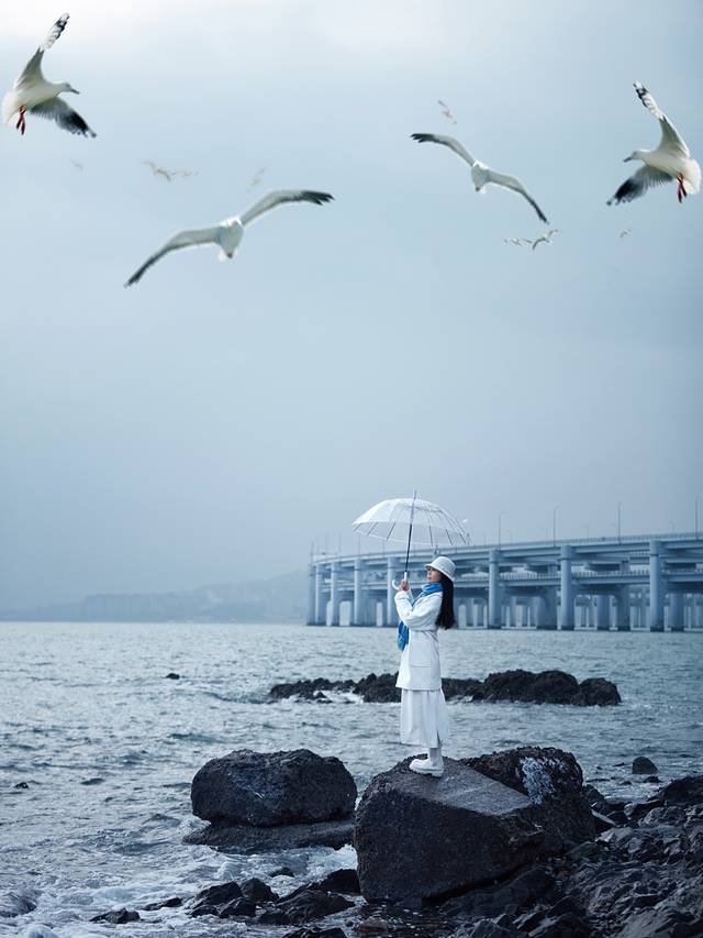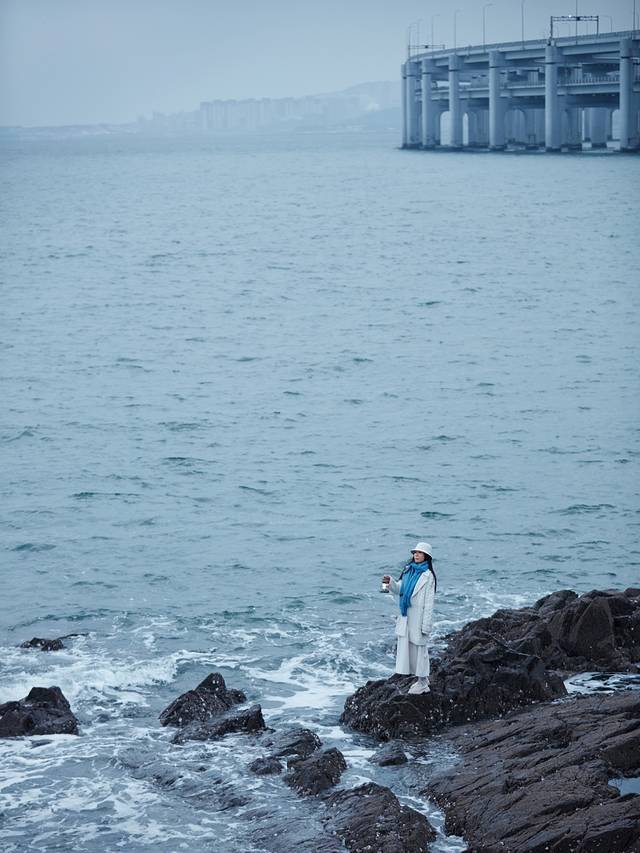 沿着公园木栈道走到海边,右手边有大礁石,站上去可以拍到身后的大桥。继续往右手深入走,走到最前面的礁石,视野会更广阔,当然走的时候注意安全,涨潮后不建议离浪太近。