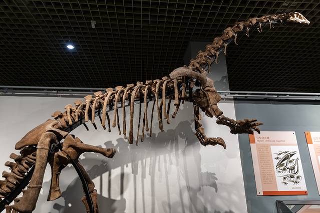 中生代展厅以中生代为背景,长度超过40米的半景画,配上栩栩如生的恐龙模型,生动展示了恐龙从诞生、发展、繁荣至灭亡的全过程,让人仿佛置身于那个遥远的时代。