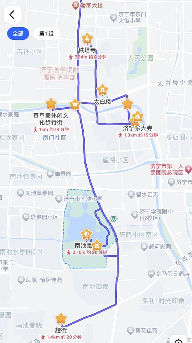 南池公园从东北方的古南池牌坊开始游览,一路往东走就能看到南池荷净,继续往东走,再往西走一点就是乔羽艺术馆,旁边不远处就是李杜雕像。从逛完南池公园去麷街就餐,距离1.3公里步行约18分钟,打车约4分钟。从麷街出来去太白楼附近拿行李,顺便买上玉堂酱园的酱菜给家人做伴手礼正合适,最后背着行李背包打车去逛少康湖湿地公园,少康湖湿地公园较远,但是离济宁北站很近,逛完坐高铁回家!