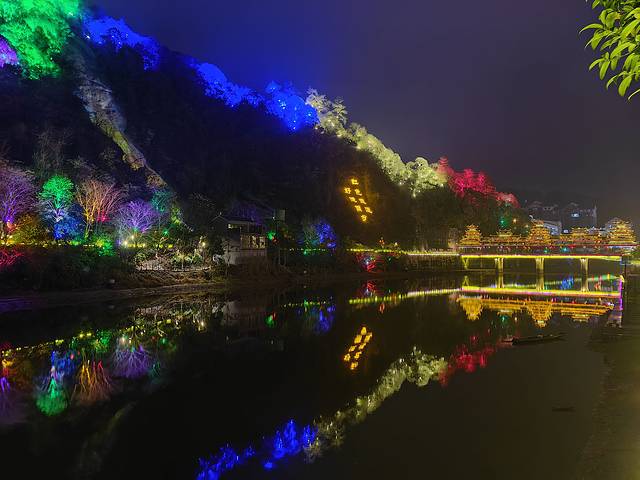 路过湖南通道,县城夜幕降临,灯光闪耀,金碧辉煌。双江沿河两岸林立的楼房,高低有序的绿树,横跨两岸的风雨桥在五彩缤纷的灯光映衬下倒映水中,犹如一幅精美画卷展开在人们的面前。