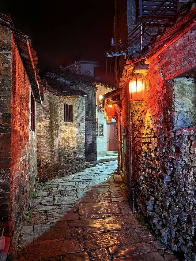 黄姚古镇的夜景给人一种宁静和舒适的感觉。"夜幕降临,华灯初上",此时的黄姚古镇让人心旷神怡,所有的烦恼都被抛之脑后。古镇的灯光映衬下的古墙和古香古色的建筑,尤其是大红灯笼和高高的挂起,营造出一种民国时期的氛围。这种灯光下的古镇,既有历史的厚重感,又不失现代的静谧之美。走在青石板路上,伴随着灯光和大红灯笼的映衬,古镇的古色古香更加突出,仿佛让人穿越回古代,使人感到无比放松和愉悦。