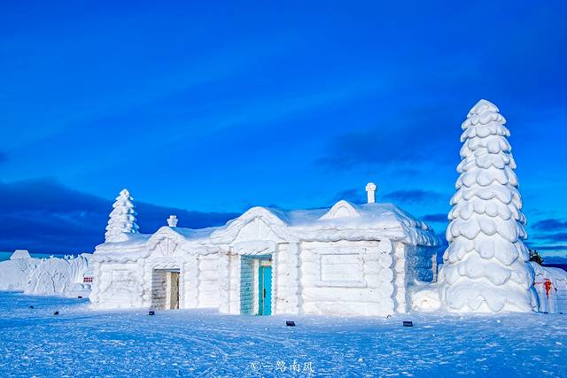 天空开始转换成蓝调,雪松、雪屋显得更加卡通,雪雕、冰雕在夕阳的照耀下闪烁着光芒。