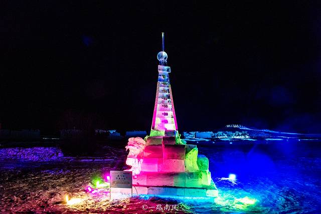 冷极冰雕的造型像一根温度计,白天玲珑剔透,晚上五彩斑斓,颜值极高,是乐园里的首席网红。