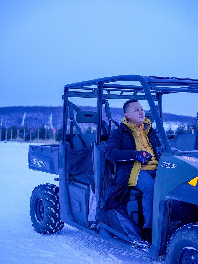 夜幕即将降临,坐上越野车,在雪地疾驰,眼前的景色不停变化,车轮扬起一阵阵雪花,又是另外一种拉风感觉。