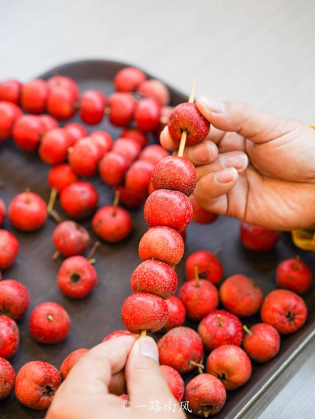 冰糖葫芦是很北方的东西,先把材料串好,然后在糖浆上快速滚一圈,随后让冰糖凝固,继续等待就大功告成了。