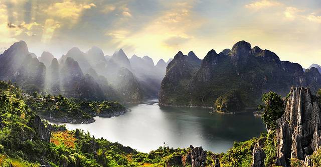 这里由成千上万座奇峰秀石组成,绵延数百公里,被誉为“天下奇观”。站在高处远眺,青灰色的秀峰似林,黄绿相间的田野成片,村庄坐落其中,小河弯弯曲曲,宛如一幅浓墨重彩的山水画卷。