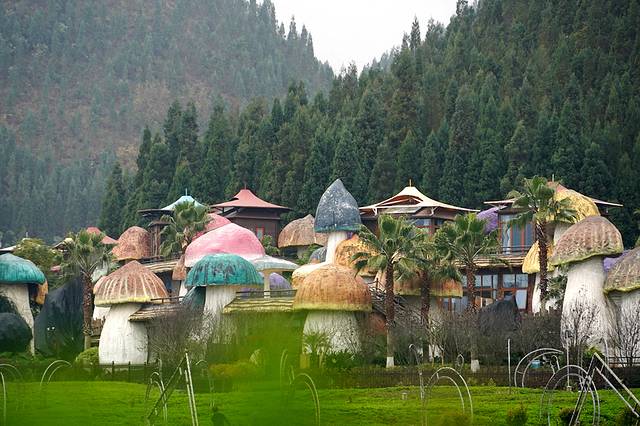 晚上我们入住在蘑菇轻奢酒店。酒店外观设计独特,像一片生长在喀斯特地貌山峰下的蘑菇群。酒店分为两期,每栋房子边上都有巨型蘑菇,很多蘑菇上还有瓢虫、蝈蝈一类的巨型昆虫。尤其二期是一条蘑菇街,走入其中就像爱丽丝梦游仙境一般。