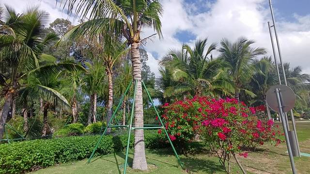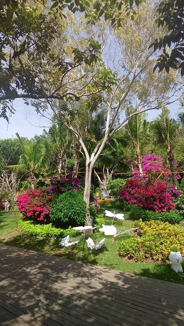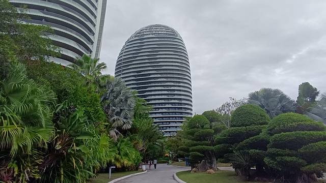 昨晚的鹿回头景区让我念念,远远凤凰岛向我招呼。上午吃过早点做车来到凤凰岛。以前可能公交直驱,现在自行过桥而去,反正我喜欢。凤凰岛位于三亚湾,紧临椰梦长廊,海月广场,一直想去却未成行,这次补上了。一条纽带联接陆地与岛上,从鹿回头高处看不大,实际不小。桥面宽阔桥下流水涔涔,置身海面上茫茫一片,心灵空旷,释怀与安静。反观鹿回头却不见了,远远轰鸣声悦耳,原来直升机盘旋,以高度欣赏海岛,应该极美。桥头有兜售直升机,海岛船票,价格的确便宜,比里面好,可以相信选择需要。沿桥直行临近桥尾,有观光车游岛,可以选乘节省时间。到终点迎面环形道标志性字体。左手边岛上度假区,右手边直升机浏览区,观光车上车点,沿海步道。右手边直行,阵阵轰鸣声给人震撼,直升机飞来飞去甚是奇妙,观赏人众多。两旁树木翠绿挺拔,整整齐齐。护堤斜向海面,海水有些混浊,有人网鱼,静静观看。左手边直行车水马龙,应接不暇,一处渡海处。整个岛没有想象的那么美好,触感陈旧,堪败之情。可能是时间久远,或新近景玩点众多而失去以前光环。两处度假区,外观呈扇形弧面,不失大气,典雅,有气势。园内绿化优美,空气优良,设施齐全,不落套,刷卡上楼,娱乐休闲也不少,住几天蛮不错的。于当初去杭州,落差犹之而过及。