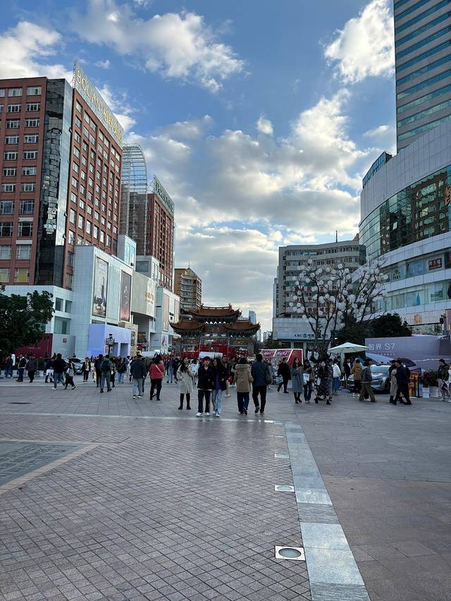 算好时间才来到孩子这儿,礼拜休息。行程去市区商场看看服饰。约好时间,在校食堂吃早点,做地铁来到老地方东方广场下,沿老路线去正义路南屏街商圈瞧瞧。早上商圈人不多,看来慢生活品质,惬意的很。昆明百货,西南商都,顺城商场三大商区奔波选择,好累啊。合适的不满意,满意的不合适,难了。中午巧遇上次没去的鹅趐饭,感觉不错。途径苹果专卖店看看,一不小心就买了。用孩子话,龙年大吉,龙年换新,那就再次体会这个手机魄力吧,4S变15了。专卖店人不少,追求品味,虚张声势吧。多彩天空弥漫天际,朵朵棉花尽放,蓝白相间,层层相莲。随意拍出几张照片,极美,自然才是真美。马三立前辈,该买的不买,不该买的买了,讨厌。继续寻觅大型商场,幸好有人介绍附近的,轻奢品牌恒隆广场,大气豪华精致,品味极高,环境优雅,价格高端。同一层商铺很少,尽显高端风尚。夜幕下,流光溢彩,色彩飞扬,风骚独领半边天。