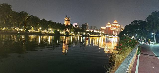 天已黑了,海大该离开,心愿也解了。再次选择从东门出去,沿人民路到钟楼骑楼老街。路上行人车辆相互抢占。既惊险又刺激,半昏半暗灯光伸入远方。人民桥异常灯显,通透的很。灯光优美,极美。过桥后一座钟楼印入眼前,在光线下格外不同凡想,古朴而深沉,海甸溪默默流淌向远方。对面骑楼老街繁华似锦,熙熙攘攘,擦肩而过,热闹的不得了。现在中山路,文化氛围,风格高出八度。经打听知道,原来泰龙小吃街停了,移到这里。全面打造骑楼中山路,铺面,装饰,格局,业态,建筑风格,路面,活动等等,的确是不错,由是夜景美不胜收,来往之人不少,彩旗高悬,灯笼飞舞,口号响亮,值得一看,希望能更好。其他街面,仍然爆棚,熙熙攘攘人群,仿佛曾经记忆又回来了,仿佛曾经过去以过去了,好啊,一切向前看,才是希望。