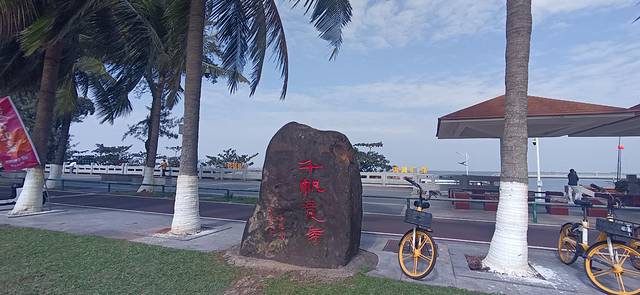 天气慢慢放晴,云雾也开了,白白的光线炙烤大地,浑身有些燥了,来来回回走一糟,喝了来个椰子。看见小黄车来个海边游,即节省时间又省力。又从假日海滩沿来路返回,一路风景一路人文一路色彩,暖暖光芒映射身上,各路景点印记一一打卡,惬意又爽快。其实西海岸就是假日海滩到西秀海滩这一段最美,虽有秀英港码头但建筑遮住了有不方便之处。也有方便之处,那就是海口湾公园,观海台,极目远眺,水天一线,风景这边独好。第一次来也是偶然知晓,不过是走的过去,比较远而且也热,而这次却是骑行,心绪却是不一样的。
