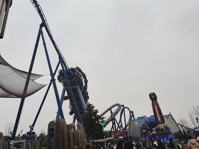 我们到的时候8点半吧,排队等候安检刷身份证进场。9点正式开门。如果打算全部项目都要玩的话,建议住一晚,可以提前1小时入园,先把排队时间久的几个项目玩了,例如禁忌之旅,侏罗纪那几个,但是冬天或下雪天都部分项目是会关闭的。由于显示当时霸天虎过山车没什么人,就先去玩这个了,安检超级严格,必须把所有东西都寄存,包括手机,卡包,帽子等,我们就是漏了一些没存又要出去存了再进去,但二次进不需要从尾巴排队,有个插入的门。
